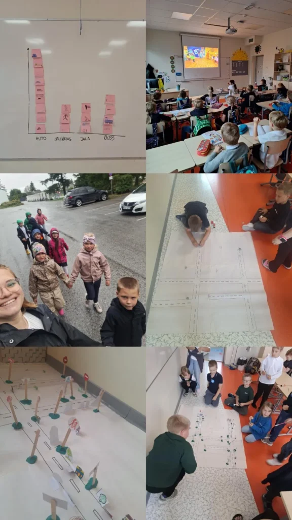 1.K klassi liiklusturvalisuse projektpäev, mille käigus toimusid suured arutelud, jalutuskäik kooli ümbruses, õpilaste kooli tulemise viiside analüüsimine, oma linna loomine jpm vahvat!
