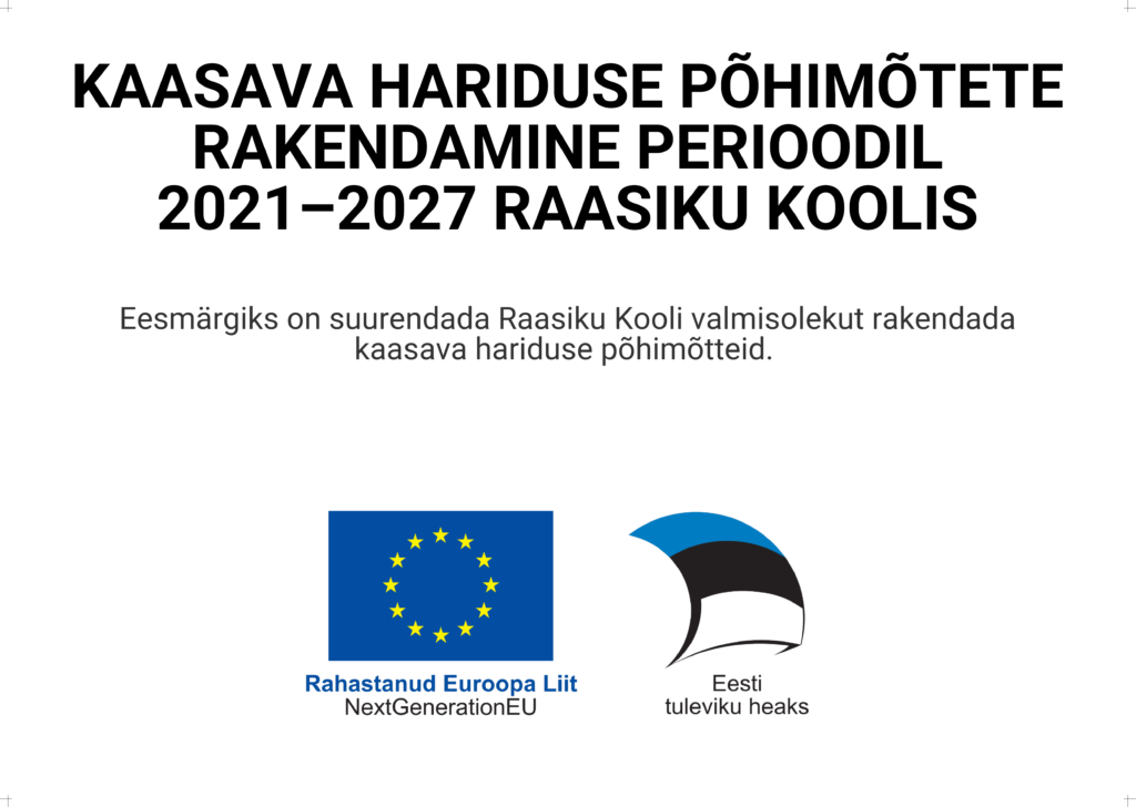 Projekti „Kaasava hariduse põhimõtete rakendamine perioodil 2021–2027 Raasiku Koolis“ tegevusi kaasrahastas Euroopa Liit. Tänu välisvahendite toele ja Raasiku Vallavalitsuse omafinantseeringule saime soetada vahendeid mahus, mis tavapärase kooli eelarve raames poleks olnud võimalik.