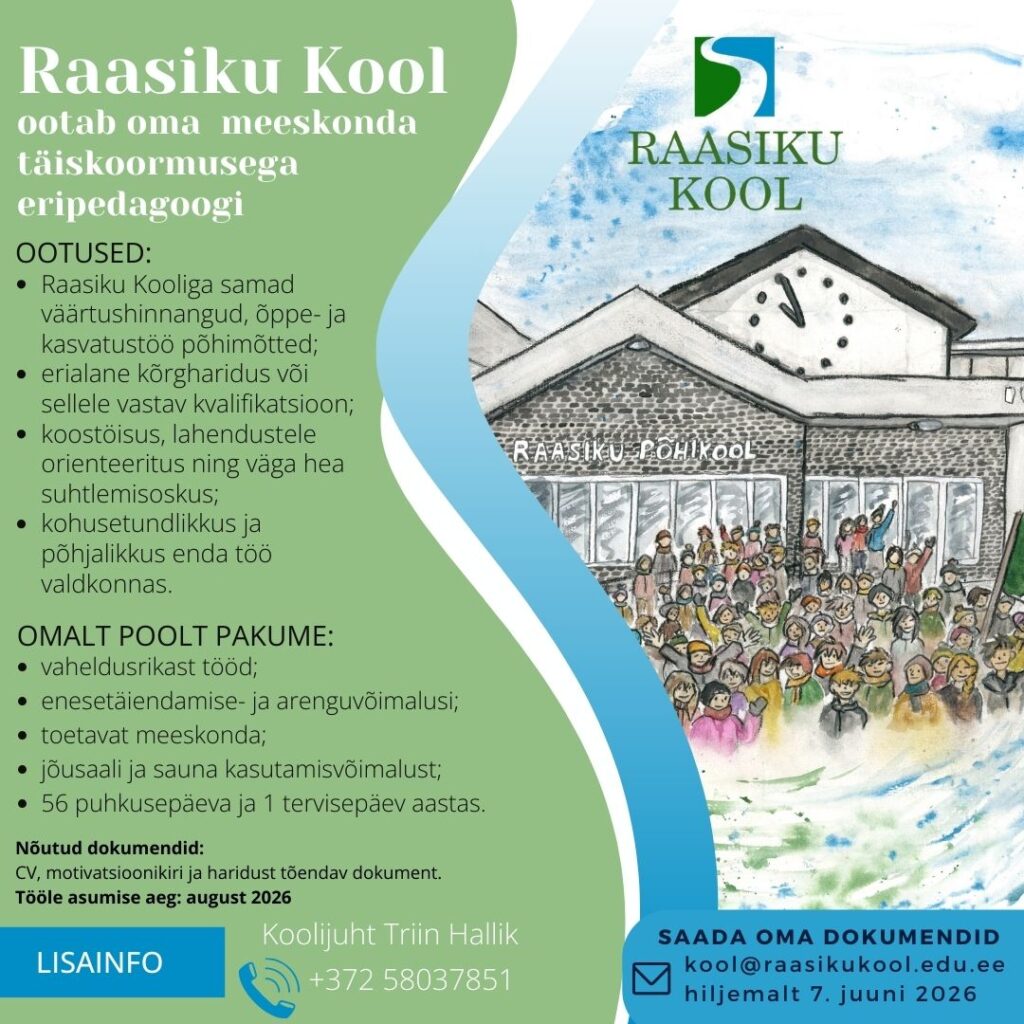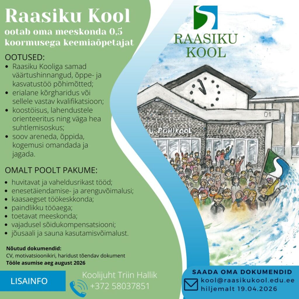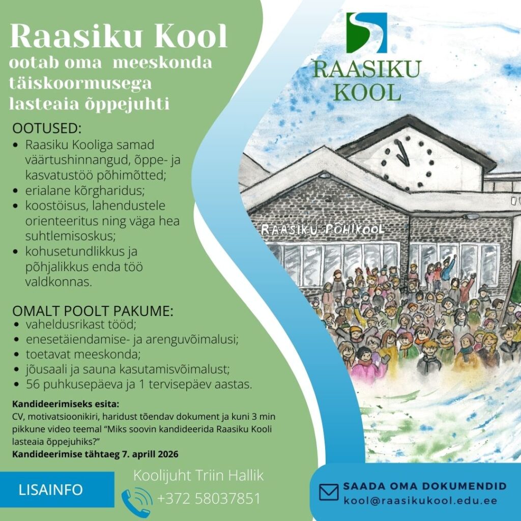 Siin lehel on aktiivsed töökuulutused. Kui me õpetajat parasjagu otsimas ei ole, kuid Sul on õpetajana töötamise kvalifikatsiooni olemasolul ja sa sooviksid just meie kooliperega liituda, anna enda tööle kandideerimise soovist märku koolijuhile aadressil triin.hallik@raasikukool.edu.ee.