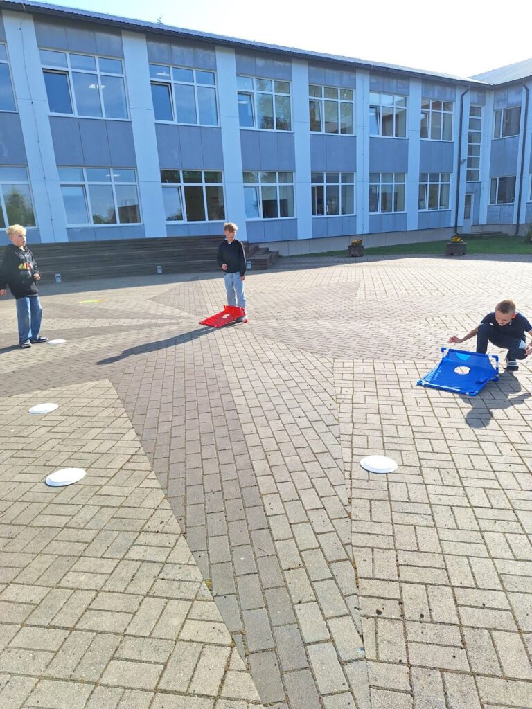 🎯6. klass tegi vene keele tunnis õuesõpet ja kordas nimisõna sootunnuseid. Taldriku alt tuli pilt vene keelde tõlkida ja määrata nimisõna sugu, siis said õiguse visata liivakotiga täpsust ja tuua enda võistkonnale punkt. kui nimisõna oli kesksoost, siis tuli kärbsepiitsaga lüüa rohelise lehe peale.