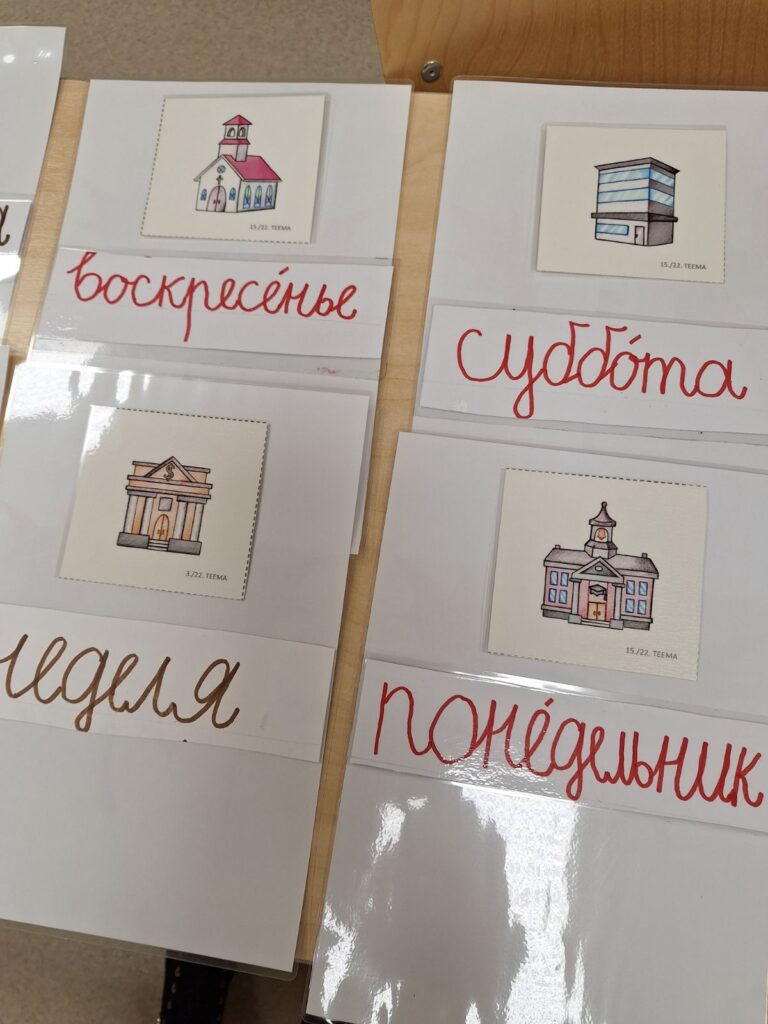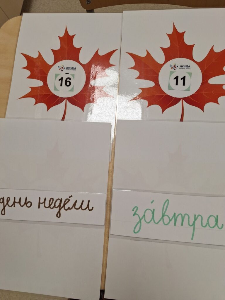 🌰8R klass mängis vene keele tunnis erinevaid õppemänge teemal: “Minu nädal”. Kõigepealt võeti üks mängukaart ja numbri järgi pidi tahvlile kirjutama selle nädalapäeva, mitmes päev see nädalas on. Teise mänguga harjutati ütlema, kus ja mis nädalapäeval sa olid. Veeretati täringut ja otsiti klassis üles selle numbriga vahtraleht. Vahtralehe taga oli nädalapäev ja mingi koht. Nende sõnadega tuli koostada lause.