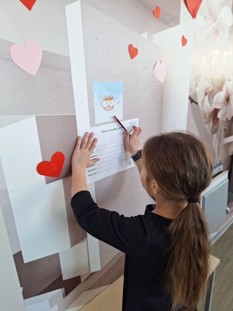 🛷1.K klass õppis Eesti rahvuslikke ja riiklikke sümboleid. Seejärel õpilane kontrollis/täiendas enda teadmisi seinal olevate vastuste lehtede abil, kus vastlakuklitel olid kirjas õiged vastused.